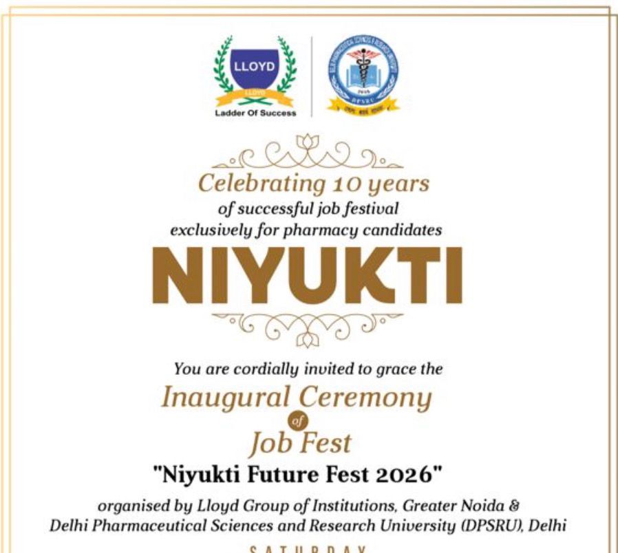 ग्रेटर नोएडा। युवाओं के लिए रोजगार के नए द्वार खोलने जा रहा ‘नियुक्ति 2026’ — फार्मेसी क्षेत्र का सबसे बड़ा जॉब फेस्ट — 4 और 5 अप्रैल 2026 को ग्रेटर नोएडा में भव्य रूप से आयोजित होगा। लॉयड ग्रुप ऑफ इंस्टीट्यूशंस (फार्मेसी) और दिल्ली फार्मास्युटिकल साइंसेज एंड रिसर्च यूनिवर्सिटी (डीपीएसआरयू) के संयुक्त तत्वावधान में आयोजित यह कार्यक्रम देशभर के युवाओं के लिए बड़ी सौगात लेकर आ रहा है।इस मेगा रोजगार महाकुंभ में 50 से अधिक राष्ट्रीय और बहुराष्ट्रीय कंपनियां भाग लेंगी, जिससे हजारों युवाओं को रोजगार के अवसर मिलने की उम्मीद है। फार्मेसी सेक्टर की अग्रणी कंपनियां रिसर्च एंड डेवलपमेंट, प्रोडक्शन, मैन्युफैक्चरिंग, क्वालिटी कंट्रोल, फार्माकोविजिलेंस, क्लिनिकल रिसर्च, सेल्स-मार्केटिंग और मेडिकल कोडिंग जैसे क्षेत्रों में भर्ती करेंगी।आयोजन की खास बात यह है कि यह ‘नियुक्ति’ का 10वां संस्करण है, जिसने पिछले वर्षों में देश के सबसे बड़े फार्मेसी जॉब फेस्ट के रूप में अपनी पहचान बनाई है। बीते संस्करण में हजारों पंजीकरण और सैकड़ों सफल चयन हुए थे, जिससे इसकी विश्वसनीयता और प्रभाव लगातार बढ़ा है।इस बड़े आयोजन से पहले 2 और 3 अप्रैल को लॉयड कैंपस-1 में प्री-इवेंट स्किल डेवलपमेंट वर्कशॉप आयोजित की जाएगी। इसमें प्रतिभागियों को कम्युनिकेशन स्किल्स, इंटरव्यू तकनीक, रिज्यूमे लेखन, ग्रुप डिस्कशन और प्रोफेशनल एटीकेट्स का प्रशिक्षण दिया जाएगा, ताकि वे प्लेसमेंट के लिए पूरी तरह तैयार हो सकें।आयोजकों के अनुसार, यह सिर्फ एक प्लेसमेंट ड्राइव नहीं बल्कि युवाओं के करियर को नई दिशा देने वाला मंच है। यहां उन्हें न केवल नौकरी के अवसर मिलेंगे, बल्कि उद्योग जगत की जरूरतों को समझने और खुद को बेहतर बनाने का मौका भी मिलेगा।देशभर के इच्छुक अभ्यर्थियों को ऑनलाइन पंजीकरण के लिए आमंत्रित किया गया है। इस रोजगार महाकुंभ में भाग लेकर युवा अपने करियर को नई ऊंचाई देने का सपना साकार कर सकते हैं।