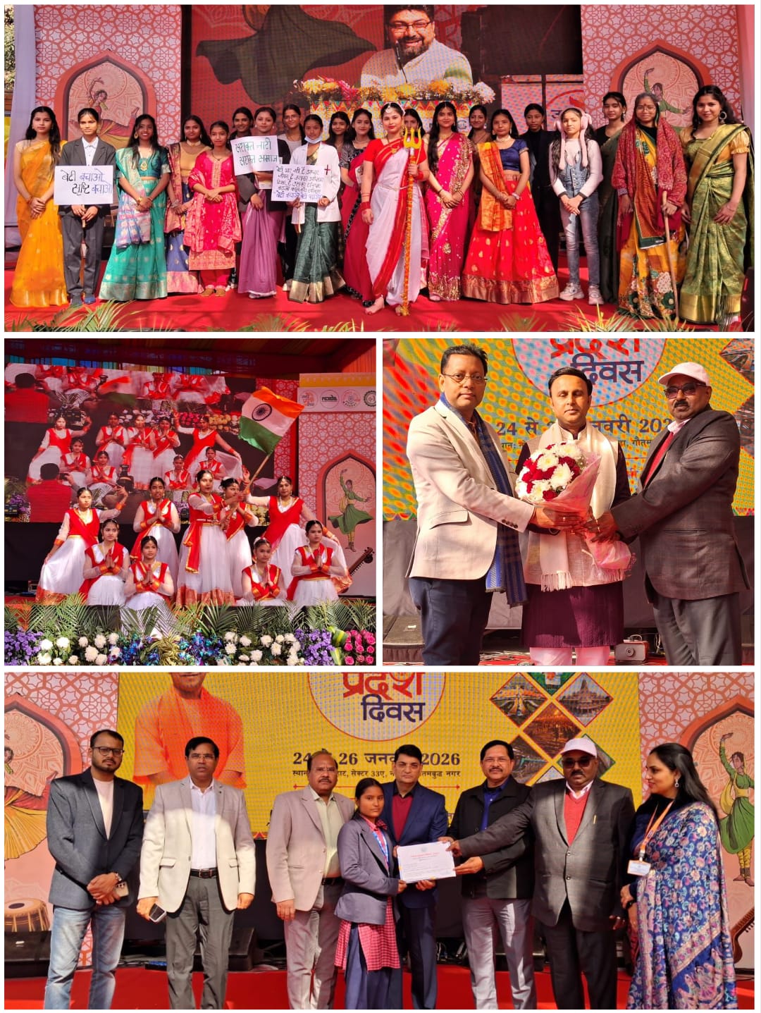 गौतमबुद्धनगर।उत्तर प्रदेश शासन के निर्देशानुसार प्रदेश की स्थापना के उपलक्ष्य में उत्तर प्रदेश की सांस्कृतिक, सामाजिक एवं विकासात्मक उपलब्धियों को जन-जन तक पहुंचाने के उद्देश्य से नोएडा के शिल्प हाट, सेक्टर–33ए में उत्तर प्रदेश दिवस–2026 के द्वितीय दिवस का भव्य आयोजन किया गया। कार्यक्रम का शुभारंभ मुख्य विकास अधिकारी गौतमबुद्धनगर डॉ शिवकांत द्विवेदी की अध्यक्षता में संपन्न हुआ, जिसमें बड़ी संख्या में जनसामान्य ने उत्साहपूर्वक सहभागिता की।मुख्य विकास अधिकारी डॉ शिवकांत द्विवेदी ने अपने संबोधन में कहा कि उत्तर प्रदेश दिवस जैसे आयोजन प्रदेश की लोककला, शिल्प, सांस्कृतिक विविधता एवं प्रतिभाओं को सशक्त मंच प्रदान करते हैं तथा युवाओं, महिलाओं एवं उद्यमियों को आगे बढ़ने के लिए प्रेरित करते हैं। उन्होंने कहा कि तीन दिवसीय इस आयोजन के माध्यम से प्रदेश की विकासात्मक योजनाओं, निवेश संभावनाओं एवं जनकल्याणकारी कार्यक्रमों के प्रति आमजन की जागरूकता और सहभागिता और अधिक सुदृढ़ होगी। उन्होंने जनसामान्य से अपील की कि वे अधिक से अधिक संख्या में पहुंचकर इस आयोजन का लाभ उठाएं।  उत्तर प्रदेश दिवस के अवसर पर आयोजित सांस्कृतिक कार्यक्रमों की श्रृंखला में विभिन्न विद्यालयों के छात्र-छात्राओं द्वारा देशभक्ति, सामाजिक चेतना एवं सांस्कृतिक विषयों पर आधारित आकर्षक प्रस्तुतियां दी गईं। आर्य पब्लिक स्कूल, राजकीय बालिका इंटर कॉलेज सेक्टर–12, राजकीय बालिका इंटर कॉलेज होशियारपुर सेक्टर–51, सेंट हुड कॉन्वेंट स्कूल, बीजीएस विजनाथन स्कूल, राव कासल पब्लिक स्कूल, वर्ल्ड स्कूल ग्रेटर नोएडा एवं सरला चोपड़ा डीएवीपी स्कूल के विद्यार्थियों ने देशभक्ति गीत, समूह नृत्य, शास्त्रीय नृत्य, नृत्य नाटिका, लघु नाटिका एवं समूह गान प्रस्तुत कर दर्शकों का मन मोह लिया।  इसके अतिरिक्त कथक नृत्यांगना अनुराधा द्वारा प्रस्तुत मनमोहक कथक नृत्य, कवि रघुवर आनंद के भावपूर्ण कविता पाठ तथा अश्रुत बैंड द्वारा बांसुरी वादन एवं मधुर गीतों की प्रस्तुति ने कार्यक्रम स्थल पर उपस्थित जनसामान्य को विशेष रूप से आकर्षित किया। इन सांस्कृतिक प्रस्तुतियों में कला, भाव और संगीत का सुंदर समन्वय देखने को मिला, जिसे दर्शकों ने एकाग्रता, उत्साह और तालियों की गड़गड़ाहट के साथ सराहा। कार्यक्रम के दौरान राजकीय बालिका इंटर कॉलेज होशियारपुर, सेक्टर–51, नोएडा के सत्र 2025–26 की पात्र छात्राओं को छात्रवृत्ति प्रमाण पत्र वितरित किए गए। अनुसूचित जाति वर्ग में कक्षा 11 की निशा एवं पूजा देवी तथा कक्षा 12 की अनामिका को, पिछड़ा वर्ग में कक्षा 09 की रश्मि एवं कक्षा 10 की समिक्षा यादव को, सामान्य वर्ग में कक्षा 11 की शिवांशी शुक्ला एवं कक्षा 12 की