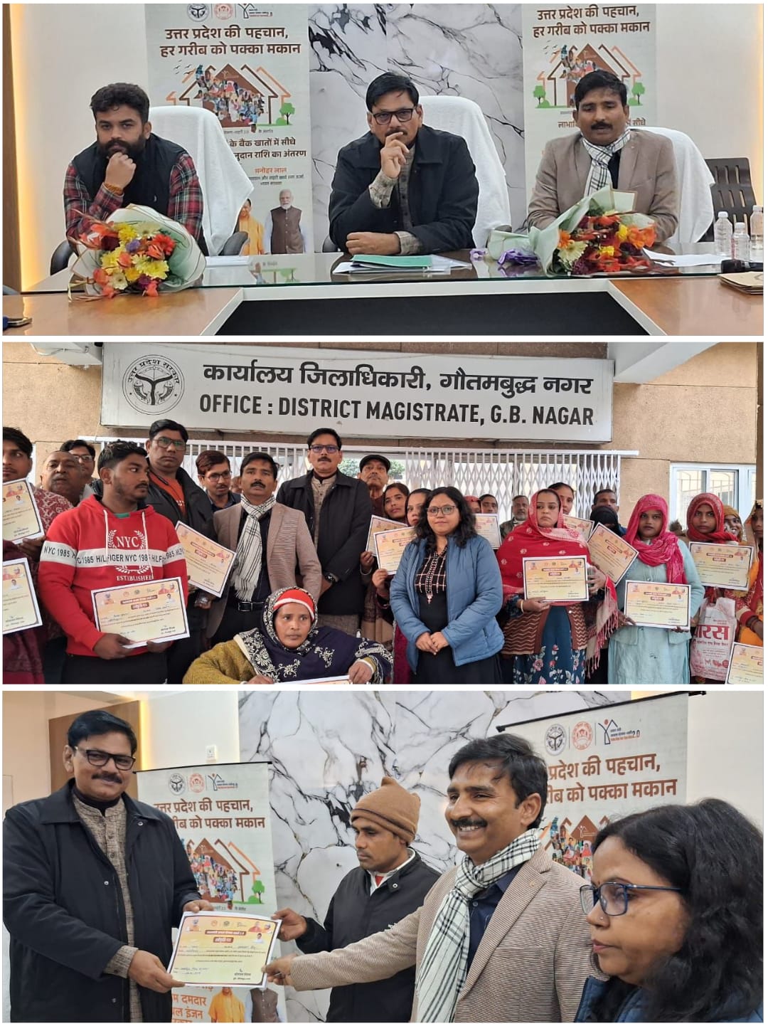 गौतमबुद्धनगर।उत्तर प्रदेश की पहचान, हर गरीब को पक्का मकान के संकल्प को साकार करते हुए प्रधानमंत्री आवास योजना-शहरी 2.0 के अंतर्गत लाभार्थियों के बैंक खातों में अनुदान राशि का अंतरण कार्यक्रम रविवार को उत्तर प्रदेश के मुख्यमंत्री योगी आदित्यनाथ की अध्यक्षता में लखनऊ में आयोजित हुआ।इसी क्रम में कलेक्ट्रेट सभागार, सूरजपुर, गौतम बुद्ध नगर में लखनऊ में मुख्यमंत्री की अध्यक्षता में आयोजित हो रहे कार्यक्रम का सजीव प्रसारण विधायक जेवर धीरेंद्र सिंह, संबंधित जनप्रतिनिधिगण, अपर जिलाधिकारी प्रशासन मंगलेश दुबे, उप जिला अधिकारी अरविंद कुमार, डिप्टी कलेक्टर वेद प्रकाश पांडेय, सिटी मिशन मैनेजर डूडा गौतम बुद्ध नगर शीला कुमारी, जिला समन्वयक डूडा गौतम बुद्ध नगर आकाश शर्मा, कम्युनिटी ऑर्गेनाइजर डूडा गौतम बुद्ध नगर रविंद्र सिंह सहित बड़ी संख्या में जनपद के लाभार्थी उपस्थित रहे। कार्यक्रम का सजीव प्रसारण एलईडी स्क्रीन के माध्यम से किया गया, जिसे उपस्थित जनप्रतिनिधियों, अधिकारियों एवं जनसामान्य द्वारा देखा गया।सजीव प्रसारण के दौरान मुख्यमंत्री उत्तर प्रदेश द्वारा लाभार्थियों से वर्चुअल माध्यम से संवाद भी किया गया एवं लाभार्थियों को प्रोत्साहित किया गया।कार्यक्रम के अंतर्गत जनपद गौतम बुद्ध नगर के कुल 199 पात्र लाभार्थियों को आवास निर्माण हेतु स्वीकृति प्रदान की गई। योजना के तहत देय अनुदान राशि की प्रथम किस्त ₹1,00,000 (एक लाख रुपये मात्र) प्रति लाभार्थी के बैंक खातों में प्रत्यक्ष अंतरण के माध्यम से अंतरित की गई। इस आर्थिक सहायता से लाभार्थियों को पक्का आवास निर्माण की दिशा में महत्वपूर्ण संबल प्राप्त होगा। प्रधानमंत्री आवास योजना-शहरी 2.0 के अंतर्गत CSMC-1 एवं CSMC-2 में चयनित लाभार्थियों में नगर पालिका परिषद दादरी के 55, नगर पंचायत बिलासपुर के 10, नगर पंचायत दनकौर के 1, नगर पंचायत रबूपुरा के 18, नगर पंचायत जेवर के 72 तथा नगर पंचायत जहांगीरपुर के 43 लाभार्थी सम्मिलित रहे। इस प्रकार जनपद में कुल 199 लाभार्थियों को योजना का प्रत्यक्ष लाभ प्रदान किया गया।कार्यक्रम के उपरांत विधायक जेवर धीरेंद्र सिंह द्वारा लाभार्थियों को स्वीकृति-पत्र वितरित किए गए। इस अवसर पर अधिकारियों द्वारा जानकारी दी गई कि प्रधानमंत्री आवास योजना-शहरी 2.0 का उद्देश्य शहरी क्षेत्रों के गरीब एवं पात्र परिवारों को सुरक्षित, स्थायी एवं सम्मानजनक आवास उपलब्ध कराना है। योजना के अंतर्गत चरणबद्ध रूप से आर्थिक सहायता प्रदान कर लाभार्थियों को आत्मनिर्भर एवं सशक्त बनाया जा रहा है।कार्यक्रम के दौरान योजना के प्रभावी क्रियान्वयन, पारदर्शिता तथा समयबद्ध लाभ वितरण पर विशेष बल दिया गया। लाभार्थियों में कार्यक्रम को लेकर विशे