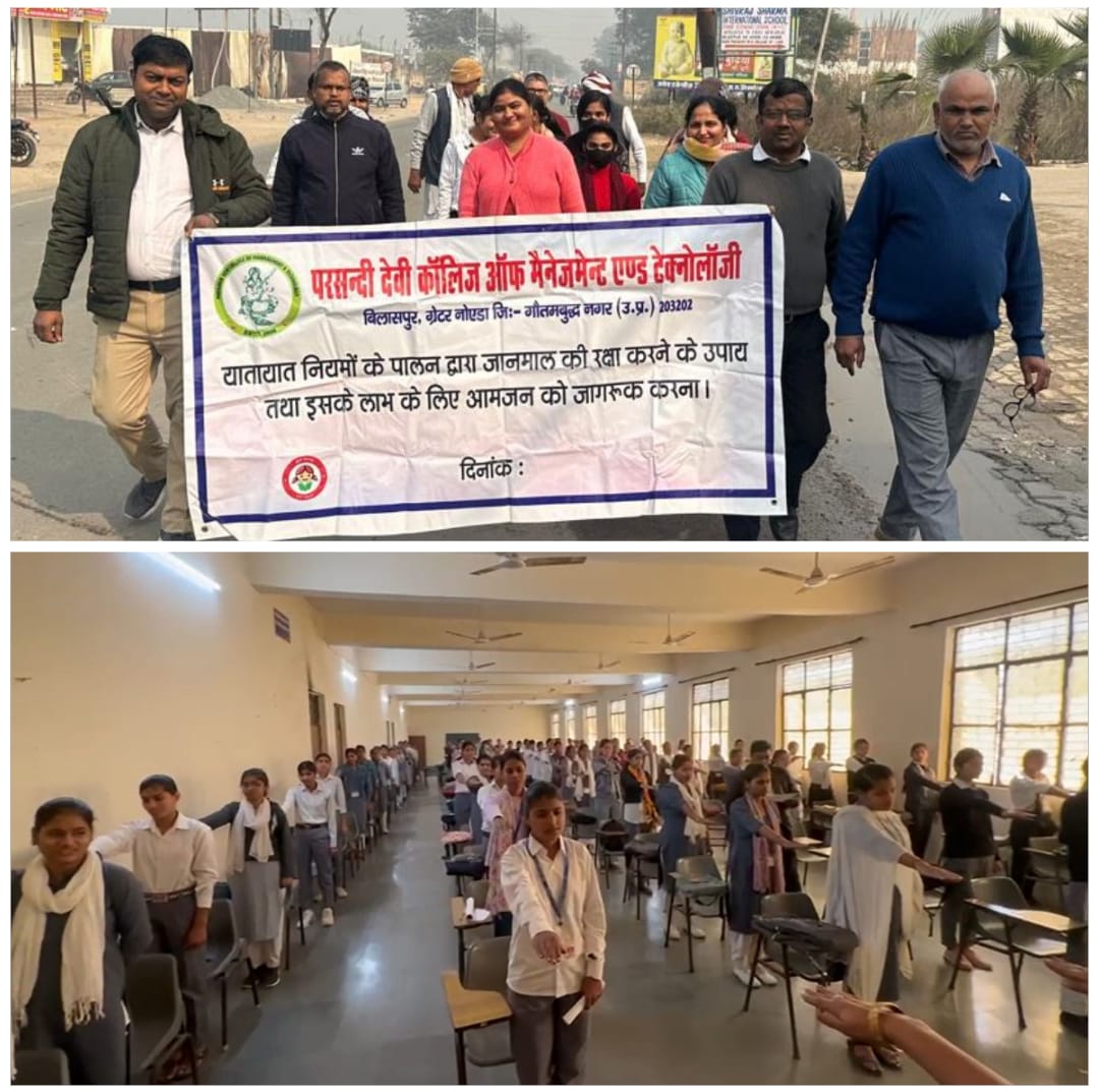 ग्रेटर नोएडा ।परसन्दी देवी कॉलेज, बिलासपुर, ग्रेटर नोएडा में जागरूकता रैली का आयोजन किया गया। यह रैली महाविद्यालय के मुख्य द्वार से नगर पंचायत बिलासपुर तक निकाली गई।रैली के माध्यम से छात्र / छात्राओं एवं आम नागरिकों को सड़क दुर्घटनाओं से निपटने के उपायों तथा यात्रा के दौरान सड़क पर होने वाली दुर्घटनाओं में कमी लाने हेतु जागरूक किया गया।रैली का संचालन महाविद्यालय के शिक्षकगण सुनील सैनी एवं पवन कुमार द्वारा किया गया।
