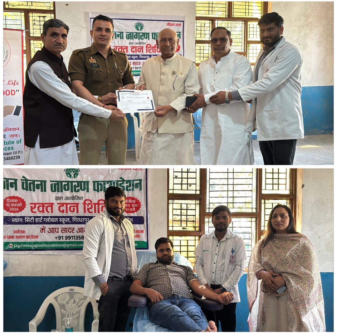 ग्रेटर नोएडा ।गिरधरपुर स्थित सिटी हार्ट ग्लोबल स्कूल परिसर में जन चेतना जागरण फाउंडेशन के तत्वावधान में एक विशाल रक्तदान शिविर का सफल आयोजन किया गया। इस शिविर में बड़ी संख्या में नागरिकों ने स्वेच्छा से रक्तदान कर मानव सेवा के इस महापुण्य कार्य में अपनी सहभागिता निभाई।कार्यक्रम में मुख्य अतिथि के रूप में पूर्व कैबिनेट मंत्री वेदराम भाटी उपस्थित रहे। उन्होंने रक्तदाताओं को प्रमाण पत्र वितरित कर उनके योगदान की सराहना की तथा रक्तदान को समाज के लिए अत्यंत आवश्यक बताया। इस अवसर पर सिटी हार्ट ग्लोबल स्कूल के चेयरमैन वी. के. उपाध्याय, यमुना अथॉरिटी के मैनेजर सुधीर कुमार, अनिल कसाना, विवेक भाटी एवं गौरव भाटी विशेष रूप से उपस्थित रहे। सभी अतिथियों ने रक्तदान शिविर को सफल बनाने में सक्रिय सहयोग प्रदान किया। रक्तदान प्रक्रिया को सुचारु, सुरक्षित एवं व्यवस्थित रूप से संपन्न कराने के लिए जन चेतना जागरण फाउंडेशन ने जिम्स (की मेडिकल टीम का विशेष आभार व्यक्त किया, जिनके कुशल संचालन से यह शिविर पूर्णतः सफल रहा।