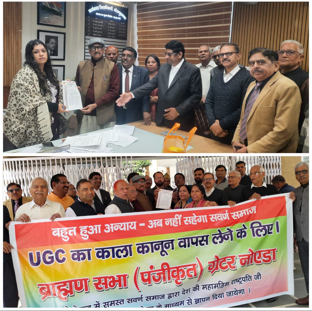 ग्रेटर नोएडा ।ब्राहमण सभा(पंजी.) उत्तर प्रदेश, ग्रेटर नोएडा के तत्वावधान में यूजीसी विनिमयम-26 को सरकार द्वारा वापिस लेने का राष्ट्रपति एवं प्रधानमंत्री के नाम का एक ज्ञापन जिलाधिकारी को हस्तगत कराया। सभा के अध्यक्ष सुरेश चन्द्र पचौरी ने बताया कि यह अधिनियम लागू होने से यह सामान्य वर्ग के उत्पीड़न का सशक्त हथियार बन जायेगा। जो बिल्कुल न्यायोचित नहीं होगा। यह एक पक्षीय निर्णय है जो समाज में असमानता और भेदभाव को बढ़ावा देगा। सभा के संयोजक जी.पी.गोस्वामी ने बताया कि ज्ञापन के माध्यम से सवर्ण समाज की यह मांग है कि इस एक पक्षीय, पक्षपातपूर्ण अधिनियम को पुन: परीक्षण हेतु वापस लिया जाए ताकि हमारी सनातन परम्परा को कोई आघात न पहुंचे। भारत को एक विकसित राष्ट्र बनाने में इसका वापस लिया जाना न्यायोचित होगा। इस अवसर पर ब्राह्मण सभा के धन प्रकाश शर्मा,कुलदीप शर्मा,वेद प्रकाश शर्मा, देवी शरण शर्मा,अशोक शर्मा,रिषीकेश त्रिपाठी,डा.एस.एन.शैली,अखिलेश पाठक, यतेन्द्र शर्मा,वेद कुमारी, रवींद्र शर्मा,प्रदीप उपाथ्थाय, कपिल शर्मा,ललित शर्मा,ममता तिवारी,गौरव उपाध्याय, प्रियंका उपाध्याय उपस्थित रहे।