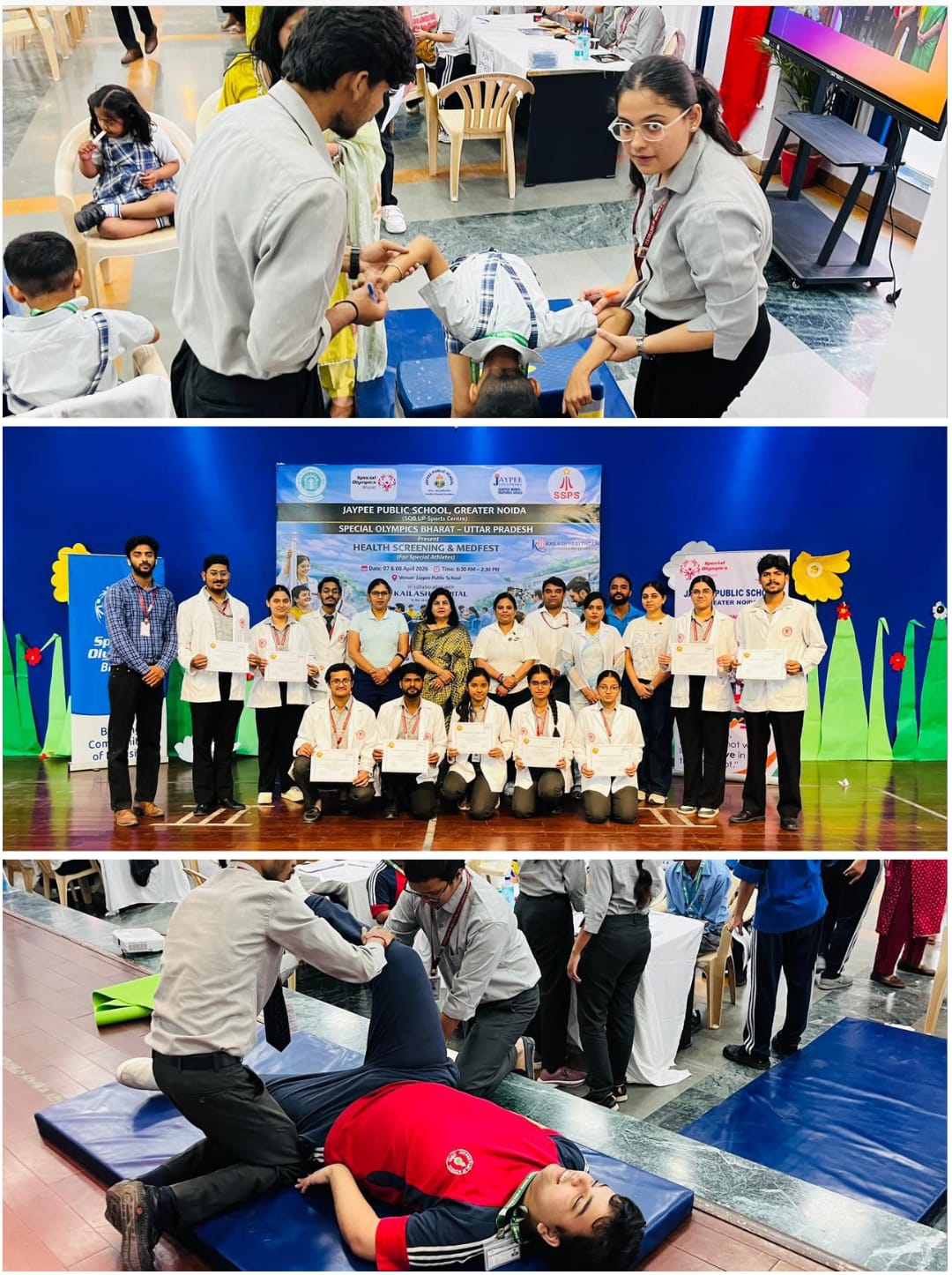 ग्रेटर नोएडा।जेपी पब्लिक स्कूल, ग्रेटर नोएडा द्वारा स्पेशल ओलंपिक्स भारत – उत्तर प्रदेश के मार्गदर्शन एवं साझेदारी में आयोजित हेल्थ स्क्रीनिंग एवं MEDFEST के दूसरे दिन विशेष बच्चों के लिए स्पेशल स्माइल्स (डेंटल चेकअप) एवं फन फिटनेस (फिजियोथैरेपी एवं फिटनेस सत्र) का सफल आयोजन किया गया।कार्यक्रम में विशेषज्ञ डॉक्टरों एवं टीमों द्वारा विद्यार्थियों के स्वास्थ्य का परीक्षण कर उन्हें आवश्यक मार्गदर्शन प्रदान किया गया। इस अवसर पर Ms. Stuti Mohan, Clinical Director, Special Olympics Bharat