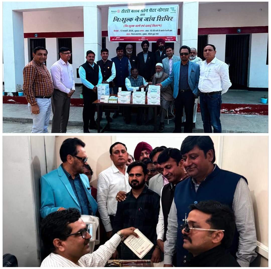 ग्रेटर नोएडा।रोटरी क्लब ग्रीन ग्रेटर नोएडा द्वारा जिला कारागार, लुक्सर में एक नेत्र जांच शिविर का सफल आयोजन किया गया। इस सेवा प्रोजेक्ट में कुल 245 लाभार्थियों की नेत्र जांच की गई, जिनमें से 200 लाभार्थियों को निःशुल्क चश्मे प्रदान किए गए तथा आवश्यकता अनुसार आवश्यक दवाइयाँ भी वितरित की गईं।इस आयोजन में जिला कारागार प्रशासन की ओर से संजय सिंह जी एवं एस.एस. गौतम का विशेष सहयोग एवं मार्गदर्शन प्राप्त हुआ, जिसके लिए क्लब उनकी हृदय से सराहना करता है।क्लब की ओर से इस सेवा कार्य में रो० सरदार मनजीत सिंह, रो० विनोद कसाना, रो० ऋषि के अग्रवाल, रो० एम.पी. सिंह, रो० संजय गर्ग, रो० रंजीत सिंह एवं रो० अंकुर गर्ग की सक्रिय उपस्थिति एवं सहभागिता रही।रोटरी क्लब ग्रीन ग्रेटर नोएडा का यह प्रयास समाज के प्रति उसकी सेवा, संवेदनशीलता और मानवीय दायित्व को दर्शाता है।क्लब भविष्य में भी ऐसे जनसेवा कार्यों के माध्यम से समाज के जरूरतमंद वर्ग तक सहयोग पहुँचाने के लिए प्रतिबद्ध है।