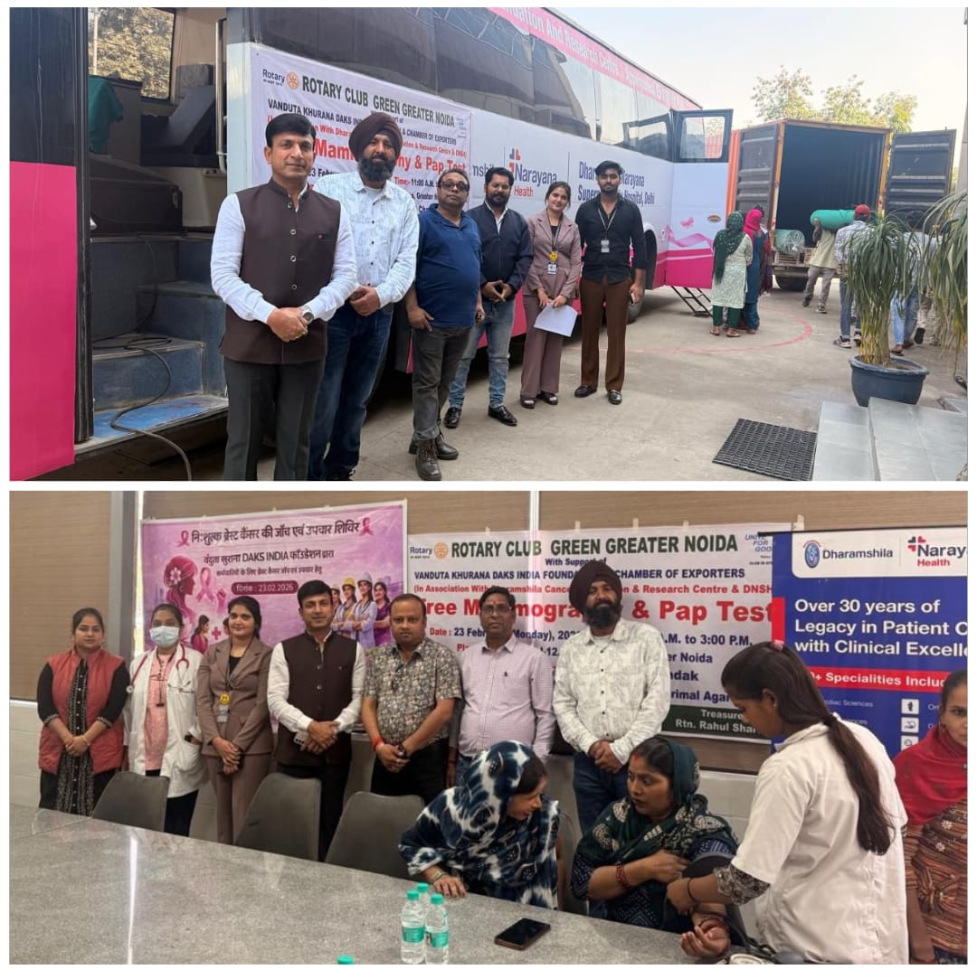ग्रेटर नोएडा।रोटरी क्लब ग्रीन ग्रेटर नोएडा द्वारा वंदुता खुराना दक्स इंडिया फाउंडेशन एवं चैम्बर आफ़ एक्सपोर्टर्स के सहयोग से तथा धर्मशीला कैंसर फाउंडेशन एंड रिसर्च सेंटर एवं DNSH के संयुक्त तत्वावधान में महिलाओं के स्वास्थ्य हेतु एक निःशुल्क मैमोग्राफी एवं पैप टेस्ट शिविर का सफल आयोजन किया गया।इस शिविर में कुल 92 महिला कर्मियों ने स्वास्थ्य परीक्षण का लाभ प्राप्त किया, जिनमें से 20 महिलाओं की मैमोग्राफी जांच भी की गई। कैंसर की समय पर पहचान एवं जागरूकता के उद्देश्य से आयोजित इस पहल को लाभार्थियों द्वारा सराहा गया। धर्मशीला कैंसर फाउंडेशन की संपूर्ण मेडिकल टीम ने अत्यंत दक्षता एवं संवेदनशीलता के साथ जांच कार्य संपन्न किया। दक्स इंडिया की ओर से एचआर टीम के तरुण भाटी एवं अंकिता सिंह का विशेष सहयोग प्राप्त हुआ।कार्यक्रम में चैम्बर ऑफ़ एक्सपोर्टर्स के अध्यक्ष शुभम् किरोड़ीमल अग्रवाल की गरिमामयी उपस्थिति रही। क्लब की ओर से क्लब अध्यक्ष रो० ऋषि के अग्रवाल, पूर्व अध्यक्ष रो० अतुल जैन, रो० रंजीत सिंह, रो० अंकुर गर्ग, क्लब सचिव रो० निखिल गर्ग, रो० यतेन्द्र गर्ग एवं रो० संजय गर्ग उपस्थित रहे तथा सेवा कार्य में सक्रिय भूमिका निभाई। रोटरी क्लब ग्रीन ग्रेटर नोएडा ने कहा कि महिलाओं के स्वास्थ्य एवं कैंसर जागरूकता के क्षेत्र में ऐसे प्रयास भविष्य में भी निरंतर जारी रहेंगे।