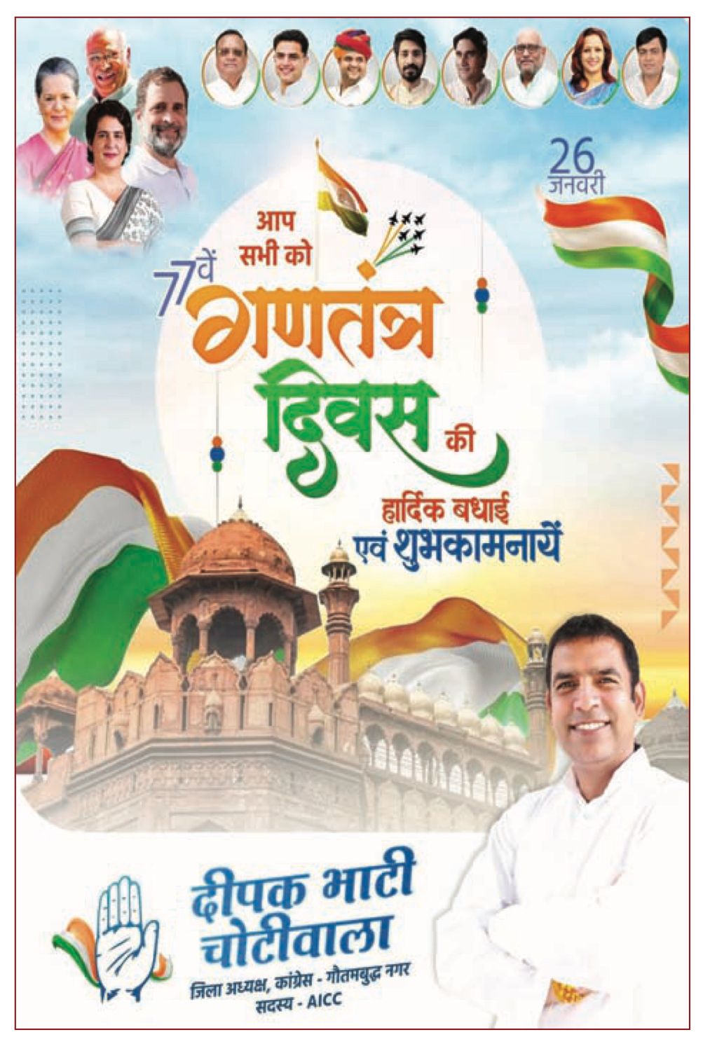 जिला अध्यक्ष कांग्रेस गौतमबुद्धनगर दीपक भाटी चोटीवाला की तरफ से सभी को गणतंत्र दिवस कि हार्दिक शुभकामनाएं