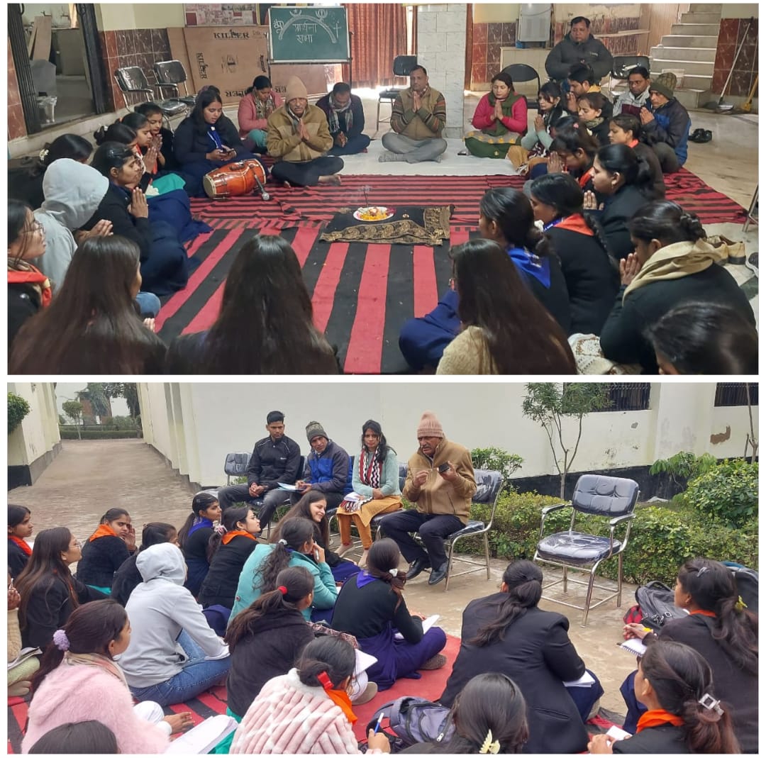 ग्रेटर नोएडा ।श्री द्रोणाचार्य (पी0जी0) कॉलिज दनकौर गौतम बुद्ध नगर के प्रांगण में बी0एड0 द्वितीय वर्ष के प्रशिक्षणार्थियों के स्काउट- गाइड कैम्प के पाँचवे दिन मनमोहन कुमार ने सभी प्रशिक्षणार्थियों को सबसे पहले प्रार्थना कराई जिसमें कॉलिज के प्राचार्य डॉ0 गिरीश कुमार वत्स, उप प्राचार्या डॉ0 रश्मि गुप्ता, अमित नागर, डॉ0 देवानन्द सिंह, डॉ0 प्रीति रानी सेन, शशि नागर, डॉ0 सुर्य प्रताप राघव, डॉ0 निशा शर्मा, डॉ0 राजीव पाण्डेय, डॉ0 कोकिल अग्रवाल,इन्द्रजीत, करन नागर, व महाविद्यालय परिवार ने साथ मिलकर ऐ मलिक तेरे बेन्दे हम, गुरू अरदास, (एक ओकांर सत नाम) आमत नजम- लब पें आती है, दुआ बनके तम्मना मेरी प्रभु कृपा मुझे बचा लिजिए, इतनी शक्ति हमे देना दाता, अच्छयुतम केशवम् कृष्णा दामोदर राम नारायण जानकी बल्लभव। उसके बाद सभी बच्चों को उन्होंने प्राथमिक चिकित्सा जिसके अन्तर्गत उन्होंने सामान के विषय में जानकारी दी जैसे- पट्टी, रूई, कैची, खपंच, डिटौल, तथा उन्होंने टेन्ट बनाना बताया जिसमे उन्होंने बताया टैन्ट की सांमग्री निम्न प्रकार से है। जिसके लिए पाँच लाठी छः कंकड़, आदि के विषय में जानकारी दी और उसको व्यवहारिक रूप में अपनाकर अपनी संस्कृति को आगे- बढाने में अह्म भूमिका निभाने पर जोर दिया जिसमें समस्त महाविद्यालय परिवार मौजूद रहा