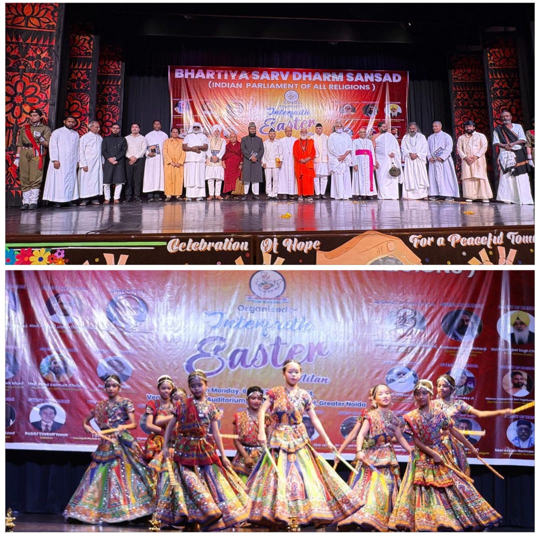 ग्रेटर नोएडा। एकता, सद्भाव और साझा आध्यात्मिक मूल्यों का सशक्त संदेश देते हुए भारतीय सर्व धर्म संसद द्वारा फा.एग्नेल स्कूल, ग्रेटर नोएडा के 17वें स्थापना दिवस के अवसर पर सतरंग ऑडिटोरियम में इंटरफेथ ईस्टर मिलन का भव्य आयोजन किया गया। इस कार्यक्रम में विभिन्न धर्मों के प्रमुख संत, धार्मिक गुरु और सामाजिक प्रतिनिधि एक मंच पर एकत्र हुए, जिन्होंने शांति, संवाद और राष्ट्रीय एकता को बढ़ावा देने का संदेश दिया।कार्यक्रम में मुख्य अतिथि के रूप में आगरा के आर्चबिशप मोस्ट रेव. डॉ. रैफी मंझाली उपस्थित रहे। उनके साथ स्वामी सुशीलजी महाराज, डॉ. इमाम उमर अहमद इलियासी (मुख्य इमाम, भारत), दिल्ली के आर्चबिशप मोस्ट रेव. अनिल जोसेफ थॉमस कुटो, आचार्य विवेक मुनि, ब्रह्मऋषि डॉ. मोहनजी, परमजीत सिंह चंडोक, हाजी सैयद सलमान चिश्ती, आचार्य याशी, वीर सिंह हितकारी, सुनील पांडेय, योग भूषण जी महाराज, सुजीत सिंह आजाद, रब्बी एज़ेकियल मालेकर, फादर बेंटो रोड्रिग्स, कमलेश भाई शास्त्री, नीलाक्षी, डॉ. मनींदर जैन, डॉ. अजय जैन, डॉ. नॉरबर्ट एसवीडी , मौलाना शाहीन क़ासमी, फादर सेबेस्टियन, रेव. फादर एंड्रयू और नरिमा ज़ायवाला सहित कई गणमान्य लोग मौजूद रहे।