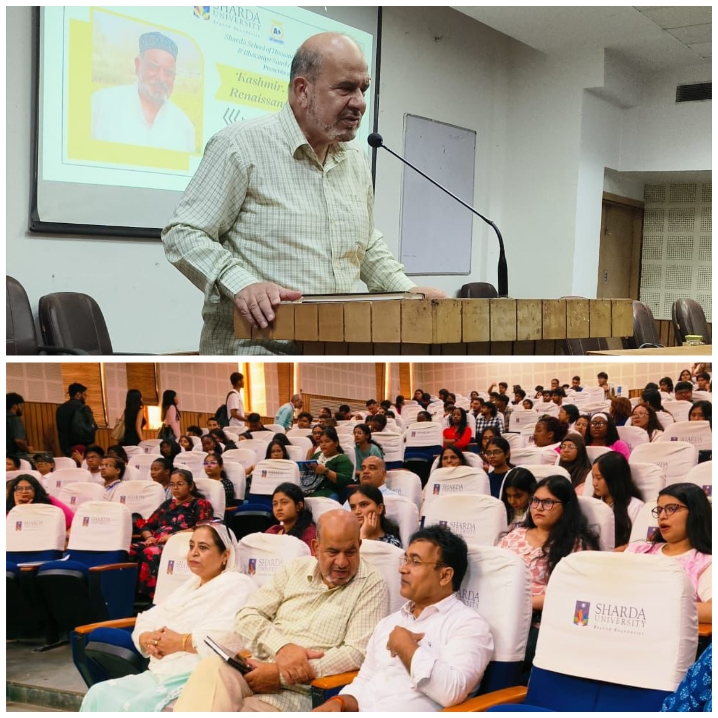 ग्रेटर नोएडा ।नॉलेज पार्क स्थित शारदा विश्वविद्यालय के भारतीय संस्कृति वैश्विक केंद्र ने भारतीय संस्कृति और प्राचीन ज्ञान पर विचार के अंतर्गत डॉ ख्वाजा फारूक रेंज़ुशाह ने कश्मीर, ज्ञान, पुनर्जागरण और शारदा’ शीर्षक से व्याख्यान दिया। वह एसएमसी के पूर्व आयुक्त, उपायुक्त, स्थानीय निकाय निदेशक, अतिरिक्त आयुक्त कश्मीर, श्रीनगर विकास प्राधिकरण के उपाध्यक्ष हैं। इसका उद्देश्य सांस्कृतिक जागरूकता और प्रशंसा को बढ़ावा देना: यह जानना कि कैसे कश्मीर ऐतिहासिक रूप से दर्शन, साहित्य, अध्यात्म और सांस्कृतिक आदान-प्रदान के एक जीवंत केंद्र के रूप में कार्य करता रहा है, जिसने भारतीय सभ्यता के व्यापक आख्यान को आकार दिया है।विश्वविद्यालय में व्याख्यान के दौरान डॉ ख्वाजा फारूक रेंज़ुशाह ने कहा कि कश्मीर को अध्यात्म, एकता और ज्ञान की भूमि बताया और कहा कि पूरा देश कश्मीर पर गर्व करता है। उन्होंने आदिल शाह की बलिदान भावना की सराहना की, जिन्होंने आतंकवादियों पर प्रहार करते हुए हिंदुओं की जान बचाई। किया। उन्होंने कहा कि कश्मीर की साझा शारदा संस्कृति भारत की प्राचीन आध्यात्मिक परंपरा की मिसाल है और शारदा यहाँ की पहली आध्यात्मिक विश्वविद्यालय रही है। छात्रों को अपनी सभ्यतागत जड़ों को अपनाने और एक समग्र विश्व दृष्टि विकसित करने के लिए प्रोत्साहित करना। शारदा पीठ को भारत की बौद्धिक क्षमता और आध्यात्मिक गहराई के प्रतीक के रूप में प्रस्तुत करना – एक ऐसा केंद्र जहां विभिन्न क्षेत्रों के ज्ञान के साधक एकत्रित हुए और भारतीय ज्ञान प्रणालियों के विकास में योगदान दिया।