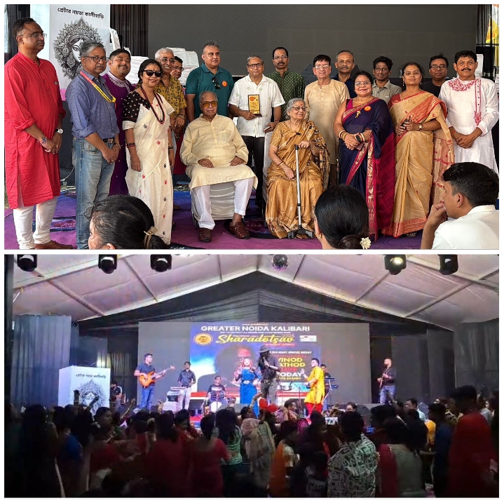 ग्रेटर नोएडा।ग्रेटर नोएडा शारदीय सांस्कृतिक समिति द्वारा आयोजित ग्रेटर नोएडा कालीबाड़ी दुर्गापूजा में महा नवमी का पर्व भक्तिभाव, परंपरा और रंगारंग सांस्कृतिक कार्यक्रमों के बीच उल्लासपूर्वक मनाया गया।दिन की शुरुआत हुई नवमी पूजा और पुष्पांजलि के साथ, जिसमें बड़ी संख्या में भक्तों ने भाग लिया। बच्चों के लिए आयोजित पारंपरिक शंखध्वनि प्रतियोगिता ने सुबह के अनुष्ठानों को और भी उत्साहपूर्ण बना दिया।इस अवसर पर शांतनु सेन, पूर्व संयुक्त निदेशक, सीबीआई, अर्बन ग्रेटर नोएडा के प्रथम निवासी तथा कालीबाड़ी दुर्गापूजा के संरक्षकों में से एक, और उनकी पत्नी सुनन्दा सेन को विशेष रूप से सम्मानित किया गया।शाम को श्रद्धालुओं ने संध्या आरती और महिलाओं द्वारा प्रस्तुत धुनुची नृत्य का आनंद लिया, जिसने मंडप का वातावरण भक्ति और उल्लास से भर दिया। सांस्कृतिक कार्यक्रमों में प्रदीप्तो भट्टाचार्य और उनके समूह द्वारा बैंड संगीत, तथा सुचित्रिता दास भट्टाचार्य द्वारा प्रस्तुत नृत्य दुर्गतिनाशिनी विशेष आकर्षण रहे। शाम की मुख्य प्रस्तुति रही लोकप्रिय बंगाली गायक प्रणय मजुमदार के गीत, जिन्होंने उपस्थित जनसमूह को मंत्रमुग्ध कर दिया।सांस्कृतिक कार्यक्रमों की कड़ी में यह भी उल्लेखनीय रहा कि महाअष्टमी की रात बॉलीवुड सुपर सिंगर विनोद राठौड़ ने अपनी प्रस्तुति से श्रोताओं को झूमने पर मजबूर कर दिया।ग्रेटर नोएडा शारदीय सांस्कृतिक समिति के महासचिव देबोकी घोषाल, जो ग्रेटर नोएडा कालीबाड़ी दुर्गापूजा के आयोजक हैं, ने कहा: “दशमी की सुबह 10 बजे सिंदूर खेला आयोजित होगा, जिसके बाद धुनुची नृत्य प्रतियोगिता होगी। दोपहर में प्रतिमा विसर्जन संपन्न किया जाएगा।”ग्रेटर नोएडा कालीबाड़ी में महा नवमी का उत्सव श्रद्धा, सामाजिक सौहार्द और सांस्कृतिक वैभव का अनोखा संगम बनकर सामने आया, जिसने दशमी के भव्य समापन की नींव रखी।