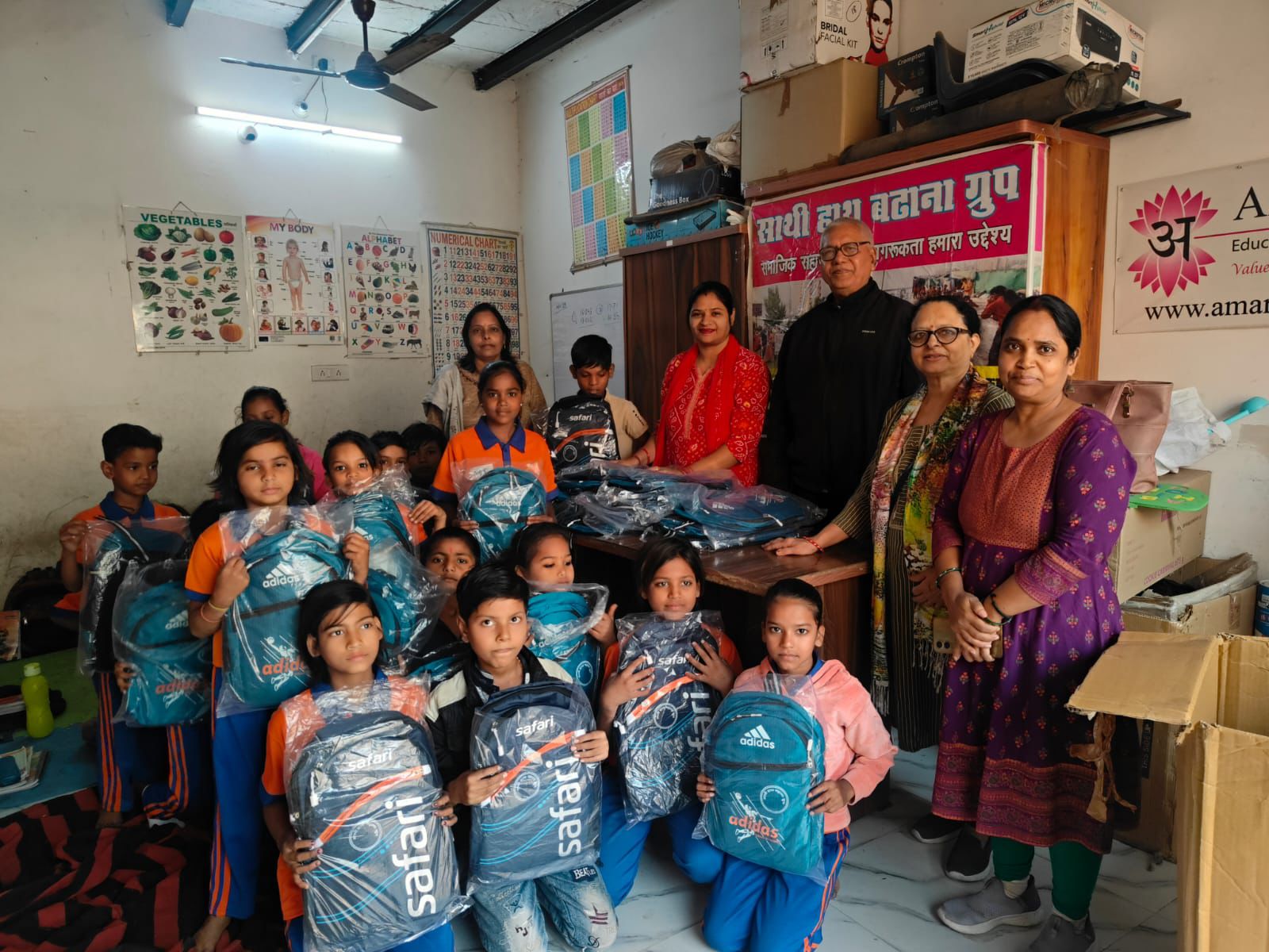 साथी हाथ बढ़ाना हेल्पिंग ग्रुप के सदस्यों ने अरिहंत आर्डन सोसाइटी के पास जरूरतमंद बच्चों को बांटे स्कूल बैग