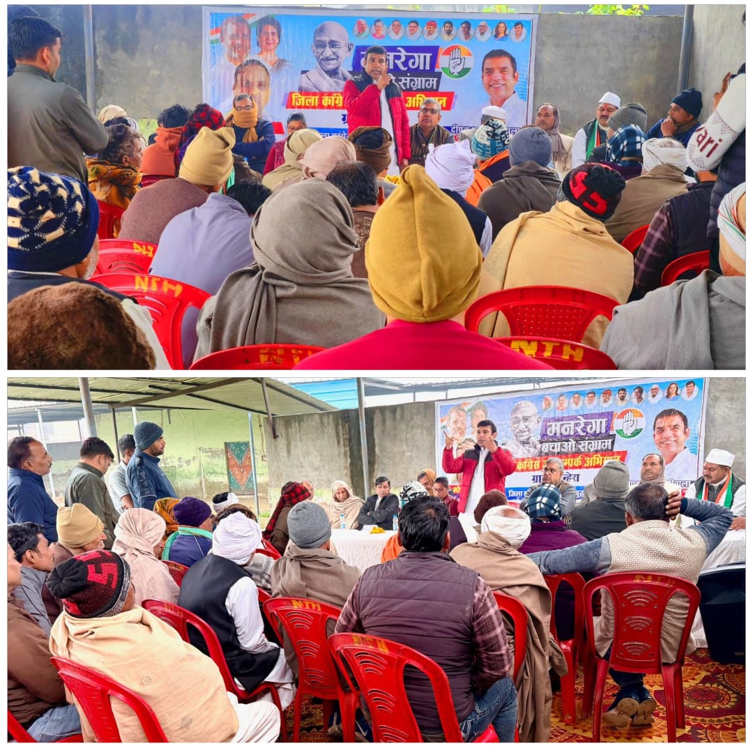 ग्रेटर नोएडा ।जनपद गौतमबुद्ध नगर में चल रहे मनरेगा बचाओ संग्राम के अंतर्गत पंचायत स्तरीय जागरूकता अभियान की श्रृंखला में आज जेवर विधानसभा क्षेत्र के रनहेरा गांव में एक महत्वपूर्ण ग्राम चौपाल का आयोजन किया गया। ग्राम चौपाल का संयोजन जिला कांग्रेस कमेटी के जिला सचिव नरेश शर्मा द्वारा किया गया। कार्यक्रम में बड़ी संख्या में ग्रामीण, मजदूर और किसान मौजूद रहे।ग्राम चौपाल को संबोधित करते हुए जिला कांग्रेस कमेटी गौतमबुद्ध नगर के अध्यक्ष दीपक भाटी चोटीवाला ने केंद्र और प्रदेश सरकार पर तीखा हमला बोलते हुए कहा कि मनरेगा को धीरे-धीरे मारने की साजिश रची जा रही है। बजट काटो, काम बंद करो, मजदूरी लटकाओ और फिर कहो कि योजना बेकार है यह गरीब विरोधी राजनीति की सबसे घिनौनी चाल है। जो सरकारें एयर कंडीशन कमरों में बैठकर फैसले लेती हैं, उन्हें गांव की भूख, मजदूर की बेबसी और किसान के पसीने की कोई चिंता नहीं है।