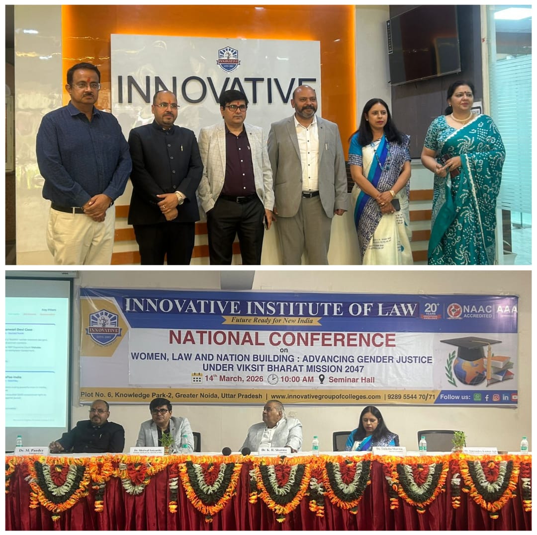 ग्रेटर नोएडा स्थित इनॉवेटिव इंस्टीट्यूट ऑफ लॉ में “महिलाएँ, विधि एवं राष्ट्र निर्माण : विकसित भारत मिशन 2047 के अंतर्गत लैंगिक न्याय की दिशा में” विषय पर एक भव्य राष्ट्रीय सम्मेलन का सफल आयोजन किया गया। इस महत्वपूर्ण शैक्षणिक आयोजन में देश के विभिन्न विश्वविद्यालयों, विधि संस्थानों और शोध संस्थानों से आए शिक्षाविदों, शोधार्थियों, विधि विशेषज्ञों तथा विद्यार्थियों ने उत्साहपूर्वक भाग लिया। सम्मेलन का उद्देश्य महिलाओं के अधिकारों, उनकी कानूनी स्थिति तथा राष्ट्र निर्माण की प्रक्रिया में उनकी सक्रिय और सशक्त भूमिका पर गंभीर शैक्षणिक विमर्श को बढ़ावा देना था। कार्यक्रम में संस्थान के चेयरमैन प्रो. के. आर. शर्मा, डीन एकेडमिक डॉ. तितिक्षा शर्मा, प्राचार्य डॉ. मृत्युञ्जय पांडेय, डॉ. शैवाल स्त्यार्थी तथा डॉ. अमरेन्द्र कुमार अजीत सहित अनेक प्रतिष्ठित शिक्षाविद् एवं छात्र-छात्राएँ उपस्थित रहे। सम्मेलन के दौरान महिला सशक्तिकरण, लैंगिक समानता, संविधानिक अधिकारों, सामाजिक न्याय तथा नीति निर्माण में महिलाओं की भागीदारी जैसे महत्वपूर्ण विषयों पर गहन विचार-विमर्श किया गया।कार्यक्रम का शुभारंभ पारंपरिक दीप प्रज्वलन के साथ हुआ, जिसके माध्यम से ज्ञान, प्रगति और सामाजिक चेतना के प्रतीक स्वरूप सम्मेलन की औपचारिक शुरुआत की गई। इसके उपरांत संस्थान के प्राचार्य डॉ. मृत्युञ्जय पांडेय ने सभी अतिथियों का पुष्पगुच्छ भेंट कर हार्दिक स्वागत एवं अभिनंदन किया। अपने स्वागत भाषण में उन्होंने कहा कि वर्तमान समय में लैंगिक समानता और न्याय की स्थापना केवल सामाजिक आवश्यकता ही नहीं बल्कि संवैधानिक प्रतिबद्धता भी है। उन्होंने यह भी कहा कि शिक्षा और विधि के माध्यम से ही समाज में समान अवसरों और न्यायपूर्ण व्यवस्था की स्थापना संभव है। उन्होंने विद्यार्थियों और शोधार्थियों को प्रेरित करते हुए कहा कि ऐसे शैक्षणिक मंच उन्हें समसामयिक सामाजिक और कानूनी मुद्दों पर विचार करने तथा अपने शोध को व्यापक समाज के हित में उपयोग करने का अवसर प्रदान करते हैं।इस अवसर पर चेयरमैन प्रो. के. आर. शर्मा ने अपने संबोधन में कहा कि राष्ट्र निर्माण की प्रक्रिया में महिलाओं की भूमिका अत्यंत महत्वपूर्ण और अनिवार्य है। उन्होंने कहा कि किसी भी समाज की प्रगति का वास्तविक मापदंड उस समाज में महिलाओं की स्थिति और उन्हें प्राप्त अवसरों से निर्धारित होता है। उन्होंने इस बात पर विशेष बल दिया कि महिलाओं को शिक्षा, संपत्ति, रोजगार और निर्णय-निर्माण की प्रक्रियाओं में समान अवसर प्रदान करना एक सशक्त और समावेशी समाज के निर्माण की दिशा में आवश्यक कदम है। उन्होंने यह भी कहा कि विकसित भारत मिशन 2047 के लक्ष्य को प्राप्त करने के 