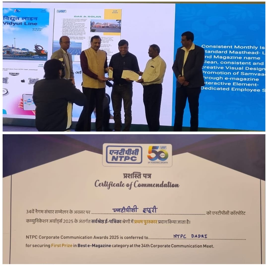 ग्रेटर नोएडा ।एनटीपीसी दादरी ने एनटीपीसी कॉर्पोरेट कम्युनिकेशंस अवार्ड्स 2025 में सर्वश्रेष्ठ ई-मैगज़ीन श्रेणी में स्वर्ण पुरस्कार प्राप्त कर एक और उल्लेखनीय उपलब्धि हासिल की।यह सम्मान 16 दिसंबर 2025 को मानेसर में आयोजित समारोह के दौरान प्रदान किया गया। एनटीपीसी दादरी की ई-मैगज़ीन ई-विद्युत लाइन को इसकी निरंतर, सृजनात्मक एवं प्रभावी संप्रेषण शैली के लिए सराहा गया। यह पुरस्कार स्टेशन की ओर से डॉ. अविनाश पाठक, वरिष्ठ प्रबंधक (राजभाषा) ने श्री ए. के. जाडली, निदेशक (मानव संसाधन) एवं सी. कुमार, कार्यकारी निदेशक (मानव संसाधन) से प्राप्त किया। इस अवसर पर के. एम. प्रशांत, महाप्रबंधक (सीसी) तथा श्री बी. के. पांडे, अपर महाप्रबंधक (सीसी) भी उपस्थित रहे।यह उपलब्धि एनटीपीसी दादरी की सशक्त, सार्थक एवं प्रभावी संप्रेषण परंपरा को दर्शाती है तथा कॉर्पोरेट कम्युनिकेशन के क्षेत्र में इसके निरंतर उत्कृष्ट प्रयासों का प्रमाण है।