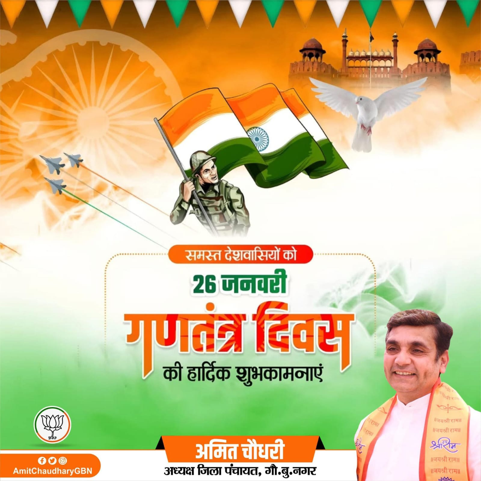 गौतमबुद्धनगर के जिला पंचायत अध्यक्ष अमित चौधरी की तरफ से समस्त देशवासियों को गणतंत्र दिवस कि हार्दिक शुभकामनाएं।