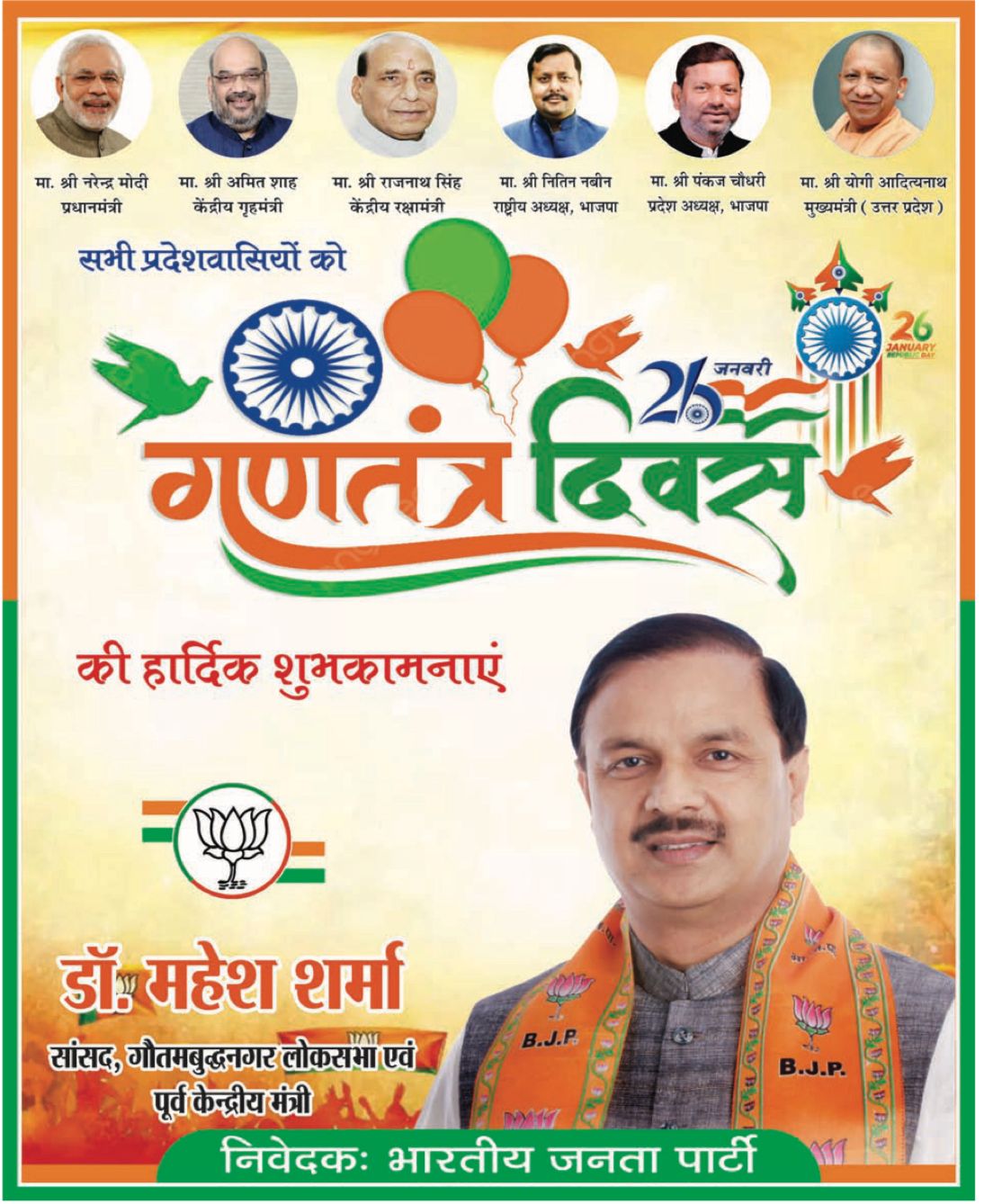 लोकसभा सांसद गौतमबुद्धनगर एवं पूर्व केंद्रीय मंत्री डॉ महेश शर्मा की तरफ से सभी प्रदेशवासियों को गणतंत्र दिवस की हार्दिक शुभकामनाएं