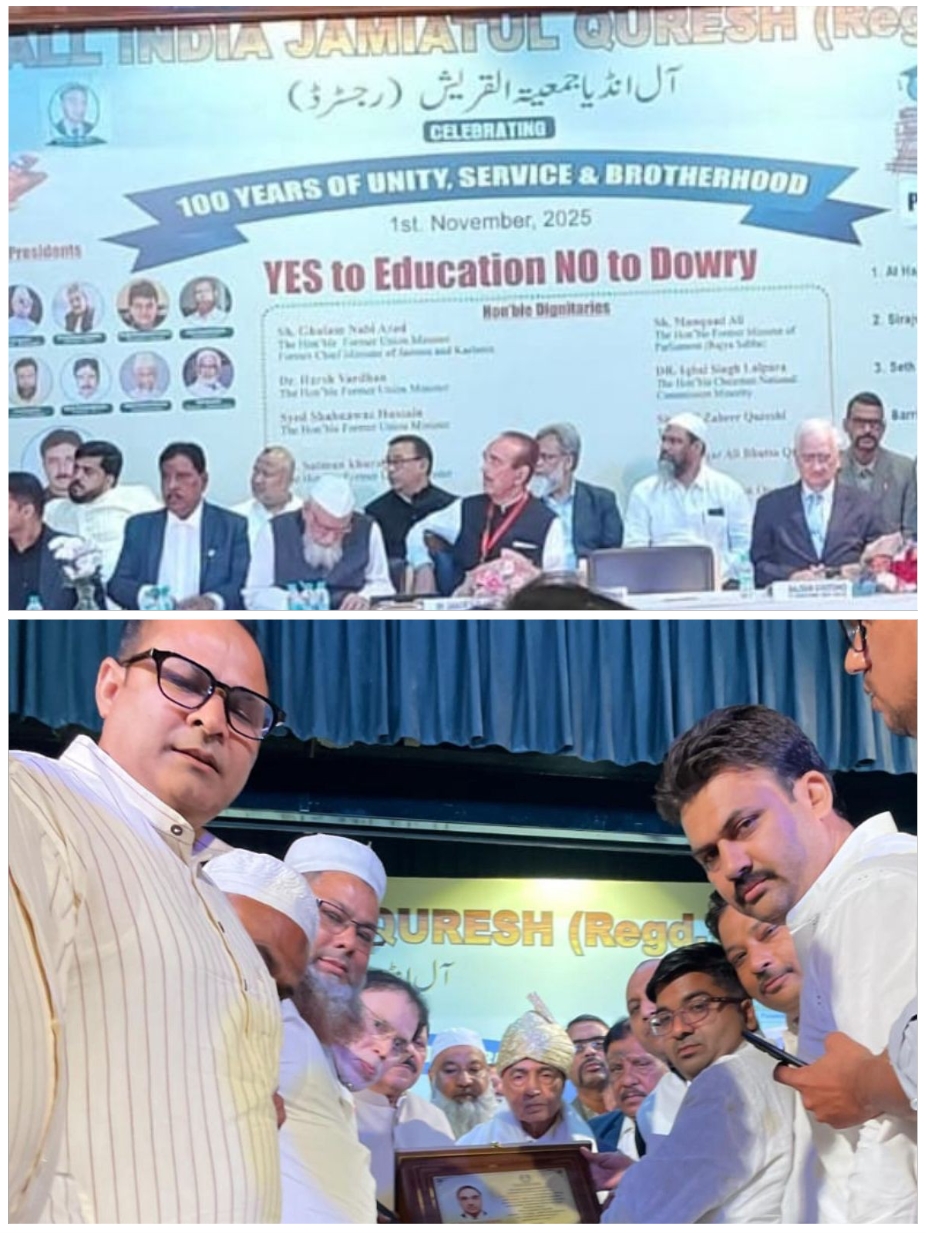 ग्रेटर नोएडा ।ऑल इंडिया जमीअतुल कुरेश के 100 वर्ष पूरे होने पर इंडियन इस्लामिक कल्चर सेंटर नई दिल्ली में आयोजित राष्ट्रीय अधिवेशन मे शाहिद अहमद कुरैशी (जिला गौतमबुद्ध नगर अध्यक्ष) ने अपनी टीम को लेकर पहुंचे थे इस मौके पर सिराजुद्दीन कुरैशी साहब (राष्ट्रीय अध्यक्ष ) को स्मृति चिन्ह से सम्मानित किया गया । इस अवसर पर पूर्व मुख्यमंत्री गुलाम नबी आजाद ,पूर्व विदेश मंत्री सलमान खुर्शीद , पूर्व कैबिनेट मंत्री सलीम इकबाल शेरवानी ,पूर्व कैबिनेट मंत्री डॉ हर्षवर्धन ,पूर्व सांसद हाजी फजलुर रहमान उत्तर, प्रदेश के सदर डॉ मोहम्मद यूसुफ दिल्ली, प्रदेश सदर मेहरबान कुरैशी ,राष्ट्रीय महासचिव मोहम्मद शफीक कुरैशी सहित 18 राज्य के सदर और पूरे इंडिया से जमीअतुल कुरेश के काउंसिल के प्रतिनिधियों की उपस्थिति में तालिया की गड़गड़ाहट के बीच राष्ट्रीय अध्यक्ष सिराजुद्दीन कुरैशी ने होनहार बच्चों को अवार्ड्स देकर सम्मानित किया । इस मौके पर गौतमबुद्ध नगर जिले की कोर टीम हकीम, उस्मान, फरीद, माहे आलम, शहजाद, इरफान, दानिश,अब्दुल वाहिद, एवम् अन्य सदस्य उपस्थित रहे।