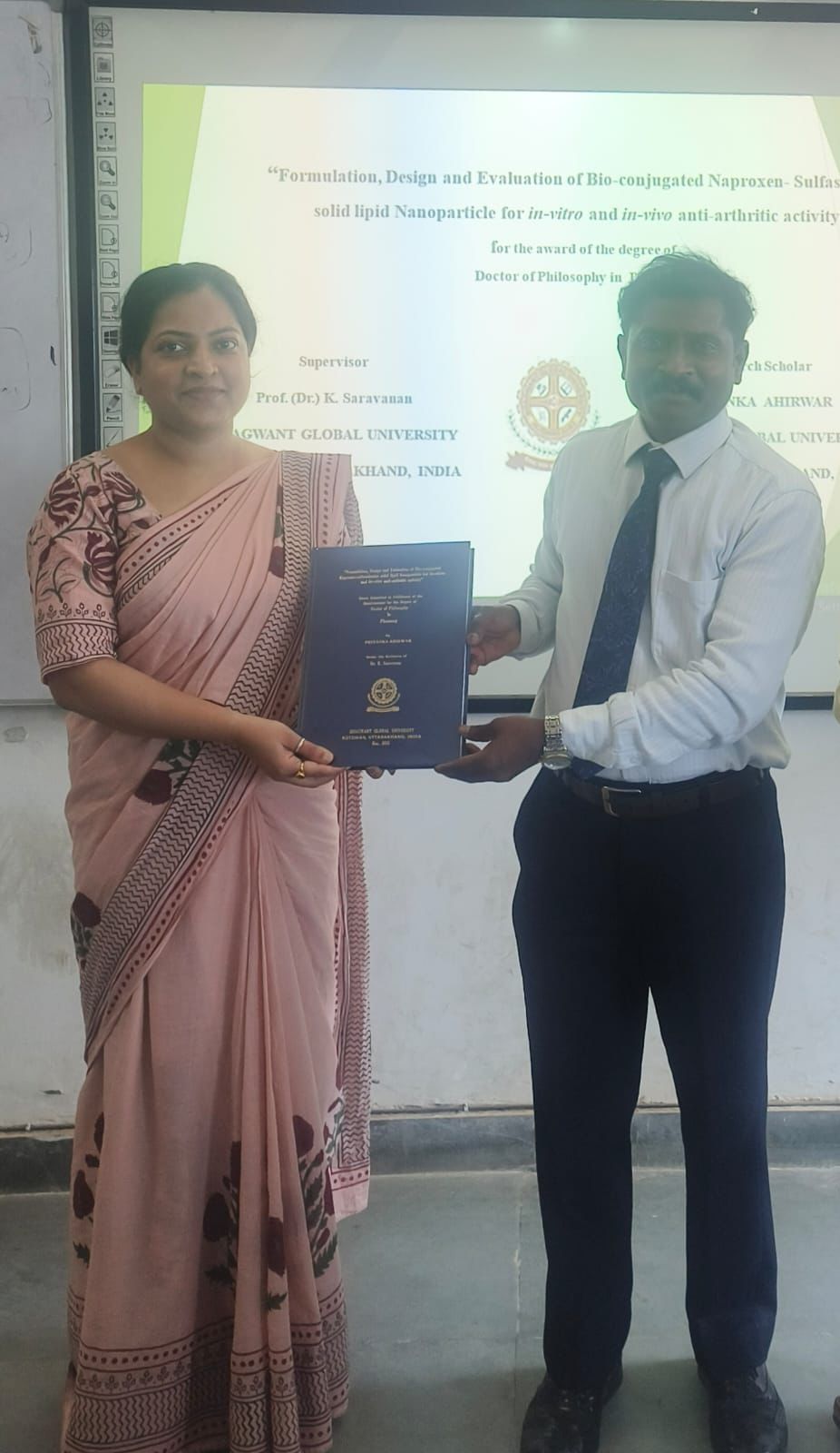 ग्रेटर नोएडा। प्रियंका अहिरवार जो वर्तमान में पी आईआईटी कॉलेज ग्रेटर नोएडा मैं फार्मेसी विभाग के प्राचार्य के पद पर कार्यरत है। मूल रूप से भोपाल मध्य प्रदेश की रहने वाली है जिन्होंने बी फार्मा एवं एम फार्मा के उपरांत भगवंत ग्लोबल विश्वविद्यालय उत्तराखंड से डॉ के. सरवणन के मार्गदर्शन में दिनांक 7 मार्च 2026 को अपनी डॉक्टरेट की उपाधि पूर्ण की जिसका शोध का topic”formulation design and evaluation of bio-conjugated Naproxen-sufasalazine solid lipid Nanoparticle for in-vitro and in-vivo Anti-Arthritic activity ” था। जिसका मुख्य उद्देश्य है आम जन को शीघ्र एवं सुलभ माध्यम से स्वास्थ्य वर्धक दवाइयां उपलब्ध कराना है यह उपाधि डॉ प्रियंका अहिरवार अपनी 3 वर्ष की कड़ी मेहनत के उपरांत प्राप्त की है। इस खुशी के अवसर पर उनके पैतृक घर भोपाल मध्य प्रदेश में हवन का आयोजन किया गया तथा सभी परिचितों ने उन्हें बधाईयां दी। पी आईआईटी कॉलेज प्रांगण के अध्यक्ष प्रोफेसर डॉक्टर भरत सिंह ने भी इस उपलब्धि के लिए उन्हें बधाई दी। और उनके उज्जवल भविष्य की कामना की। संस्थान के अन्य सभी प्राध्यापक गनों एवं सदस्यों ने भी उन्हें बधाइयां दी।