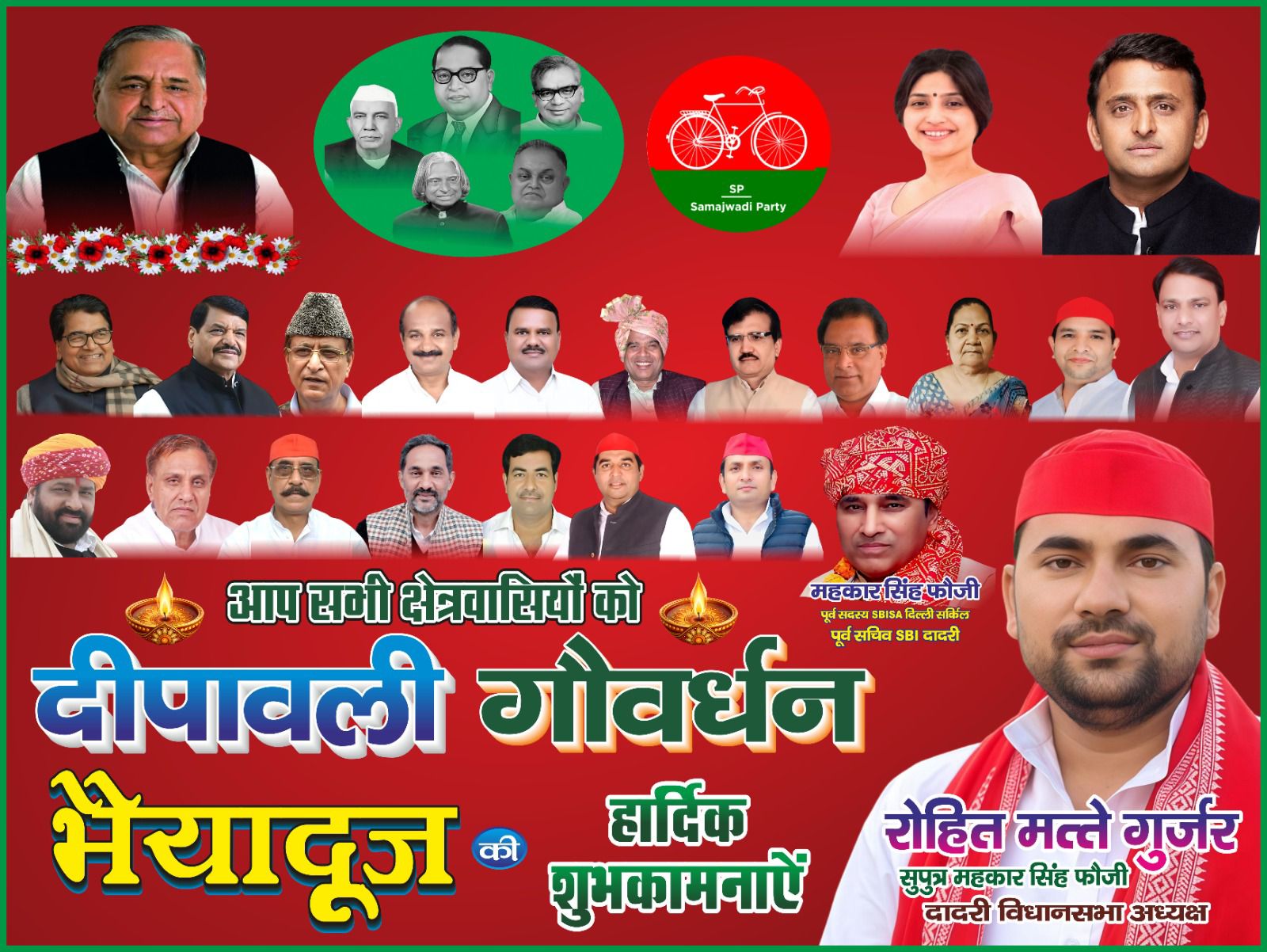 रोहित मत्ते गुर्जर सुपुत्र महकार सिंह फौजी (दादरी विधानसभा अध्यक्ष समाजवादी पार्टी) की तरफ से सभी को दीपावली, गोवर्धन एवं भैयादूज की हार्दिक शुभकामनाएं