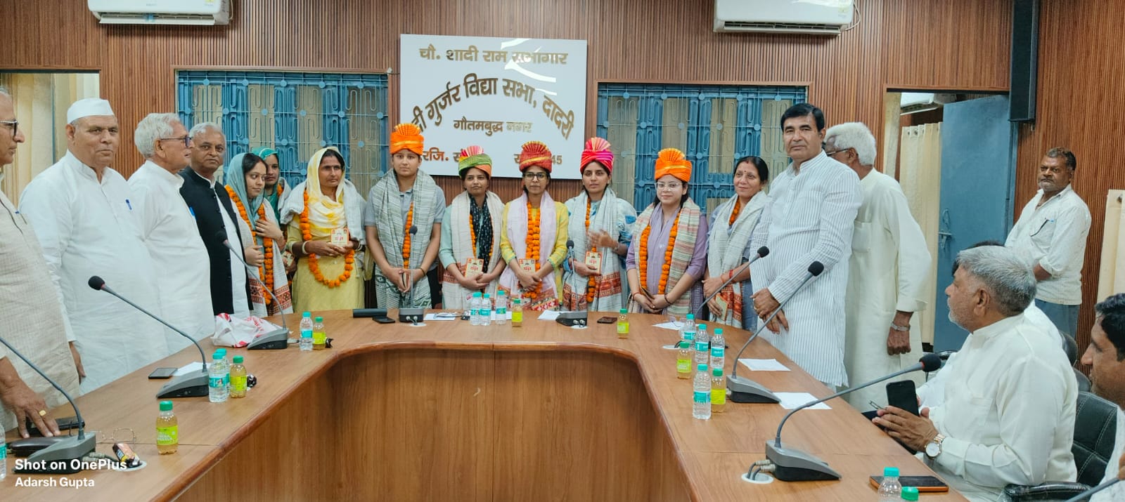 ग्रेटर नोएडा । गुर्जर विद्या सभा, दादरी, जिला गौतमबुद्ध नगर , संचालक” मिहिर भोज शिक्षण संस्थान / कालिज के तत्वाधान में एक विशेष बैठक का आयोजन चौधरी शादी राम सभागार स्थित गुर्जर शहीद भवन में गुर्जर विद्या सभा के वरिष्ठ उपाध्यक्ष देवेन्द्र टाइगर एडवोकेट की अध्यक्षता में हुआ l सभा का संचालन गुर्जर विद्या सभा के सचिव एडवोकेट राम शरण नागर ने किया lइस विशेष बैठक में राष्ट्रीय सिविल सेवा परीक्षा एवं प्रांतीय सिविल सेवा परीक्षा में चयनित प्रतिभाओं और राष्ट्रीय स्तर पर खेलों में विजयी प्रतिभाओं का सम्मान किया गया l प्रांतीय सेवा में कुमारी निकिता पंडित जलालपुर, कुमारी नेहा नागर, कुमारी निधि नागर डेरी डेरी मचछा, कुमारी मानसी बैसोया बरौला, राष्ट्रीय सेवा में चयनित कुमारी मुस्कान बैसोया सादौपुर, कर्मचारी चयन आयोग (संयुक्त स्नातक स्तर) परीक्षा द्वारा आयकर विभाग में चयनित कुमारी मुस्कान भाटी कैमराला, कुमारी नीशू भाटी मायचा, राष्ट्रीय स्तर पर भाला फेंक में बराजं मेडल विजेता कुमारी कनिशका तौंगड झुममन पुराखंदेडा को पुष्प गुच्छ देकर, शोल ओढ़ाकर, पगड़ी सिर पर पहनाकर स्वागत किया गया। इस अवसर पर गुर्जर विद्या सभा के उपाध्यक्ष एडवोकेट श्याम सिंह भाटी, कोषाध्यक्ष डॉ उदयवीर सिंह, वरिष्ठ सदस्यगण बलबीर सिंह आर्य, मास्टर ब्रह्म पाल नागर, वरिष्ठ अधिवक्ता जय प्रकाश नागर,मनवीर नागर, राजेश भाटी प्रधान मेनेजर, एडवोकेट चरण जीत नागर, आजाद प्रधान, राम चन्द्र वर्मा पूर्व एसडीएम, राजपाल सिंह इंजीनियर प्रधानाचार्य आदि अनेक गणमान्य लोग उपस्थित थे l