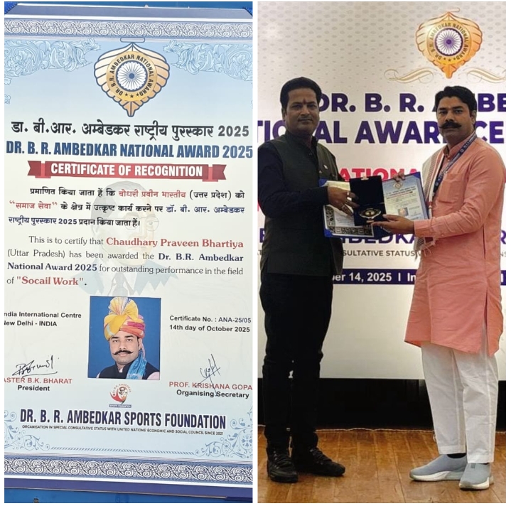 करप्शन फ्री इंडिया संगठन के संस्थापक चौधरी प्रवीण भारतीय ने बताया की नई दिल्ली के इंडिया इंटरनेशनल सेंटर के सभागार में आयोजित डॉक्टर बी आर अंबेडकर पुरस्कार समारोह 2025 में देश के विभिन्न राज्यों से आए विभिन्न प्रतिभाओं को डॉ बी.आर. अंबेडकर अवार्ड से सम्मानित किया। चौधरी प्रवीण भारतीय ने बताया कि करप्शन फ्री इंडिया संगठन के बैनर तले वह पिछले 12 वर्षों से ग्राम विकास,समाज सुधार,समाज सेवा,पर्यावरण को बेहतर बनाने एवं भ्रष्टाचार अत्याचार शोषण के ख़िलाफ़ आंदोलन के माध्यम से लोगों को न्याय दिलाने का कार्य कर रहे हैं। उनके इस कार्य को देखकर डॉ बी.आर. अंबेडकर स्पोर्ट्स फाउंडेशन के द्वारा उन्हें यह अवार्ड देकर सम्मानित किया, उन्होंने बताया कि संगठन का प्रत्येक कार्यकर्ता कर्मठता,ईमानदारी एवं निष्ठापूर्वक गांव समाज एवं राष्ट्र के प्रति समर्पित होकर कार्य कर रहा है। चौधरी प्रवीण भारतीय ने कहा कि यह अवार्ड संगठन के प्रत्येक कार्यकर्ता को समर्पित है। चौधरी प्रवीण भारतीय ने डॉक्टर बी आर अंबेडकर स्पोर्ट्स फाऊंडेशन के अध्यक्ष मास्टर बी.के भारत,जनरल सेक्रेटरी उत्तम,डॉक्टर कृष्ण गोपाल,राजू भड़ाना,सुंदरम के पटेल आदि का आभार प्रकट किया।