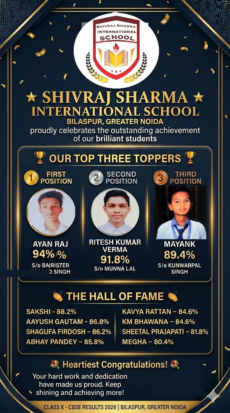 ग्रेटर नोएडा । शिवराज शर्मा इंटरनेशनल स्कूल के विद्यार्थियों ने सीबीएसई कक्षा 10 बोर्ड परीक्षा में शानदार सफलता प्राप्त कर विद्यालय का नाम गौरवान्वित किया है। छात्रों की मेहनत, शिक्षकों के मार्गदर्शन और अभिभावकों के सहयोग से यह उत्कृष्ट परिणाम संभव हुआ है। विद्यालय की प्रधानाचार्या विनीता शर्मा ने सभी सफल विद्यार्थियों को बधाई देते हुए उनके उज्ज्वल भविष्य की कामना की।