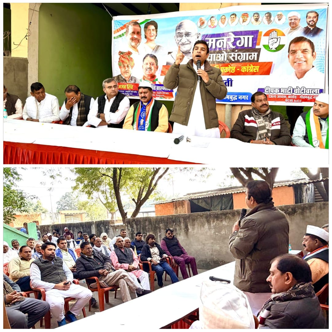 ग्रेटर नोएडा ।जनपद गौतमबुद्ध नगर में मनरेगा बचाओ संग्राम के अंतर्गत चल रहे ग्राम चौपालों के अंतिम चरण में दादरी विधानसभा क्षेत्र की नई बस्ती ग्राम पंचायत में एक विशाल ग्राम चौपाल का आयोजन किया गया। कार्यक्रम की अध्यक्षता धर्म सिंह जीनवाल ने की एवं संयोजक अजब सिंह रहे। चौपाल में बड़ी संख्या में ग्रामीण, मजदूर एवं युवा उपस्थित रहे। ग्राम चौपाल में सर्वप्रथम महात्मा गाँधी जी की पुण्यतिथि पर उन्हें पुष्पांजलि अर्पित कर नमन किया गया इसके उपरांत चौपाल को संबोधित करते हुए जिला कांग्रेस कमेटी गौतमबुद्धनगर के अध्यक्ष दीपक भाटी चोटीवाला ने केंद्र की मोदी सरकार पर तीखा हमला बोलते हुए कहा कि मनरेगा जैसी गरीबों की जीवन रेखा योजना को भाजपा सरकार योजनाबद्ध तरीके से कमजोर कर रही है। बजट में कटौती, समय पर मजदूरी का भुगतान न होना, काम के दिनों में लगातार कमी ये सब इस बात का प्रमाण हैं कि मोदी सरकार को न तो गरीब की परवाह है और न ही ग्रामीण भारत की चिंता।दीपक भाटी चोटीवाला ने बताया कि 12 जनवरी से विधानसभा-वार शुरू की गई मनरेगा बचाओ ग्राम चौपालों की श्रृंखला के अंतर्गत अब तक 22 ग्राम चौपालों का आयोजन किया जा चुका है, जिनमें ग्रामीणों को यह समझाया गया कि किस प्रकार मोदी सरकार मनरेगा जैसी रीढ़ योजना को नेस्तनाबूद करने पर तुली हुई है, ताकि मजदूर अपने हक से वंचित हो जाए और गांवों से पलायन बढ़े।उन्होंने कटाक्ष करते हुए कहा कि एक ओर भाजपा सरकार आत्मनिर्भर भारत का ढोल पीटती है, वहीं दूसरी ओर गरीब मजदूर से उसका सबसे बड़ा सहारा छीनने में लगी है। यह आत्मनिर्भरता नहीं, बल्कि गरीब को असहाय बनाने की साजिश है।जिला अध्यक्ष ने स्पष्ट किया कि मनरेगा बचाओ संग्राम अब केवल ग्राम चौपालों तक सीमित नहीं रहेगा, बल्कि 25 फरवरी तक जिला स्तरीय घेराव-प्रदर्शन, रैलियों एवं आंदोलन के माध्यम से इसे एक राष्ट्रीय जन आंदोलन के रूप में खड़ा किया जाएगा। उन्होंने चेतावनी दी कि यदि केंद्र सरकार ने मनरेगा को उसके मूल स्वरूप में बहाल नहीं किया, तो कांग्रेस पार्टी सड़क से संसद तक संघर्ष और तेज करेगी।चौपाल के दौरान ग्रामीणों ने भी अपने अनुभव साझा करते हुए बताया कि महीनों-महीनों मजदूरी नहीं मिलती, काम की मांग करने पर आवेदन निरस्त कर दिए जाते हैं और प्रशासन पूरी तरह मूकदर्शक बना हुआ है अंत में दीपक भाटी चोटीवाला ने कहा कि कांग्रेस पार्टी गरीब, मजदूर और किसान की लड़ाई अंतिम सांस तक लड़ेगी। मनरेगा बचाओ संग्राम भाजपा की जनविरोधी सोच के खिलाफ एक निर्णायक संघर्ष है।इस मौके पर अजय चौधरी, धर्म सिंह जीनवाल, अजब सिंह, दुष्यंत नागर, कृष्ण पाल, मुकेश शर्मा, महेंद्र प्रधान, अशोक पंडित, देवी शरण प्रधान, महाराज सिंह, सतवीर प्रधान, धर्मवीर प्रधान, 