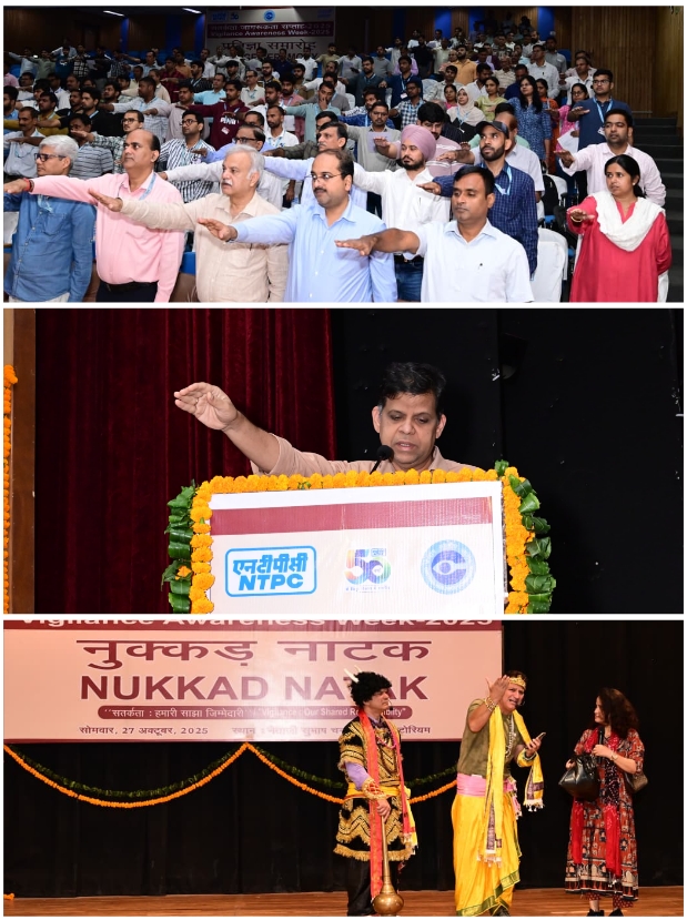 ग्रेटर नोएडा।एनटीपीसी दादरी के प्रशासनिक भवन स्थित नेताजी सुभाष चंद्र बोस ऑडिटोरियम में सतर्कता जागरूकता सप्ताह 2025 का शुभारंभ किया गया। इस वर्ष का विषय है — “सतर्कता: हमारी साझा जिम्मेदारी”। कार्यक्रम के अंतर्गत प्रतिज्ञा समारोह एवं नुक्कड़ नाटक का आयोजन किया गया। मुख्य अतिथि श्री चंद्रमौलि काशिना, कार्यकारी निदेशक एवं परियोजना प्रमुख (एनटीपीसी दादरी) ने सभी अधिकारियों और कर्मचारियों को सत्यानिष्ठा प्रतिज्ञा दिलाई। उन्होंने इस अवसर पर कहा कि सत्यानिष्ठा एवं सतर्कता केवल एक दायित्व नहीं, बल्कि प्रत्येक कर्मचारी की सामूहिक जिम्मेदारी है, जो संगठन को मजबूत बनाती है। कार्यक्रम में ए.के. मिश्र, मुख्य महाप्रबंधक (प्रचालन एवं अनुरक्षण), विल्सन अब्राहम, महाप्रबंधक (मानव संसाधन) सहित अन्य महाप्रबंधकगण, विभागाध्यक्ष, वरिष्ठ अधिकारी एवं कर्मचारीगण उपस्थित रहे। कार्यक्रम का प्रमुख आकर्षण रहा नुक्कड़ नाटक, जिसमें प्रतिभागियों ने रोचक एवं प्रभावशाली ढंग से यह संदेश दिया कि ईमानदारी और सतर्कता से ही संगठन एवं समाज का समग्र विकास संभव है। प्लांट परिसर एवं टाउनशिप के विद्यालयों में भी इस नाट्य प्रस्तुति का मंचन किया जा रहा है। यह सप्ताह 27 अक्टूबर से 2 नवम्बर 2025 तक सतर्कता विभाग द्वारा आयोजित किया जा रहा है। इस दौरान परियोजना स्थित विद्यालयों में तथा कर्मचारियों एवं उनके परिजनों के लिए विभिन्न प्रतियोगिताओं का आयोजन किया जाएगा।